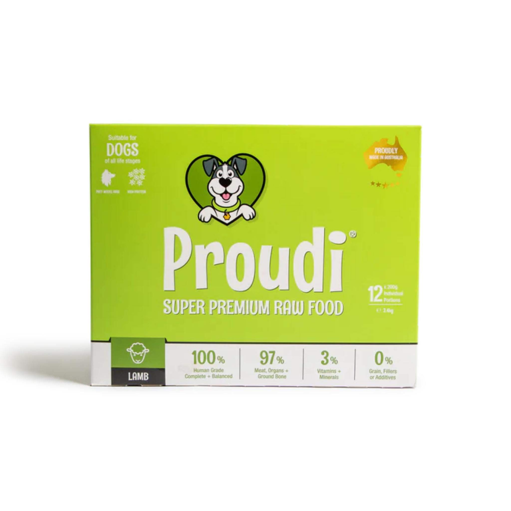 Proudi Premium Raw Lamb patties provide a complete and balanced meal for dogs of all ages