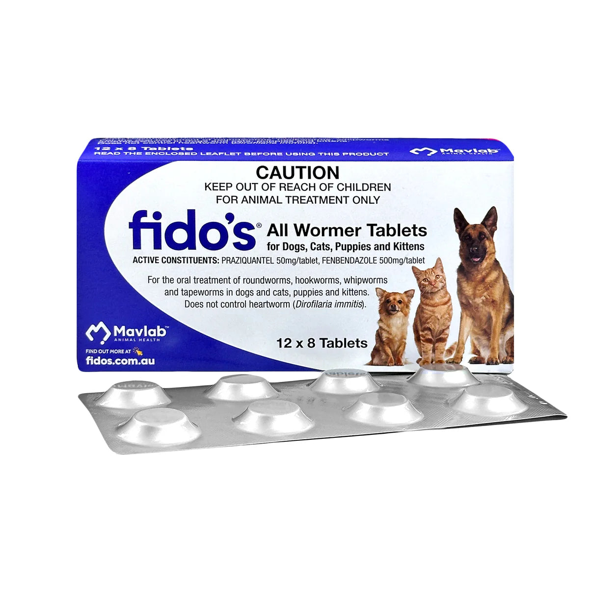 For the oral treatment of roundworms, hookworms, whipworms and tapeworms (including the hydatid tapeworm) in dogs, cats, puppies and kittens. Does not control heartworm. Contains praziquantel 50mg / tablet and fendendazole 500 mg / tablet. Available in 100 tablet blister packs.