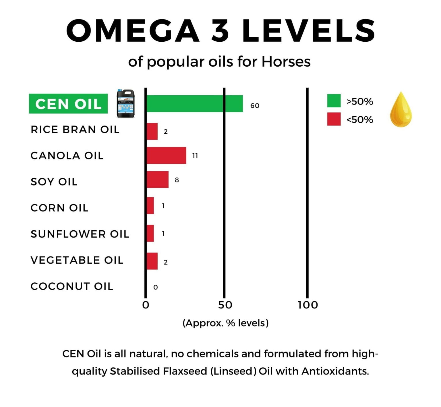 For maintenance 10mL per 100kg Bodyweight daily. Increase according to workload. CEN Oil should be the last additive to the feed. Based on a 500kg horse